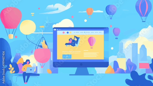 Flat Design Concept of Website Header Slider with Hot Air Balloons and Cityscape - Vector Illustration for Digital and Graphic Resources, Web Design Inspiration, Creative Website Elements