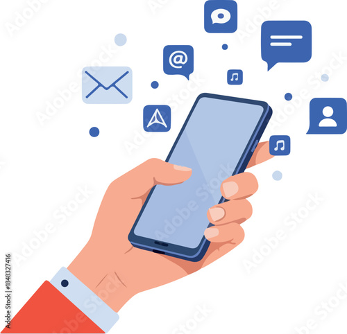 Flat Design Hand Holding Phone Blue With Social Media Icons White Background
