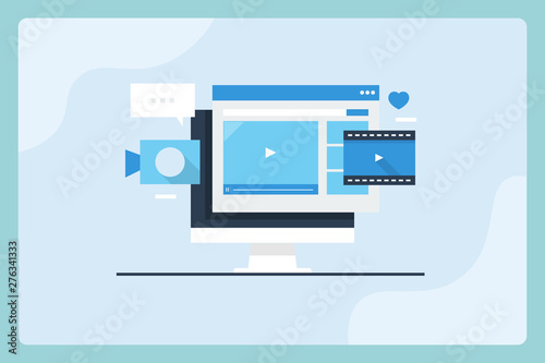 Flat design illustration concept of video marketing, social network communication, online webinar, audience engagement concept. Vector web banner with blue background.