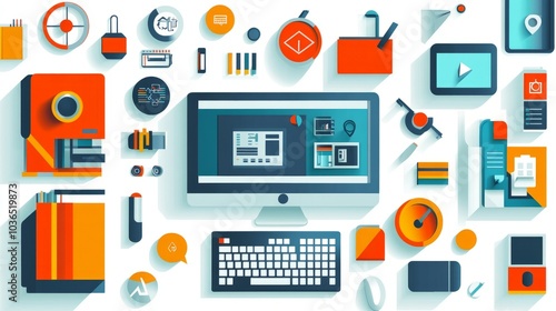 Flat design illustration of a desktop computer, keyboard, and various icons and objects related to web design and digital marketing.
