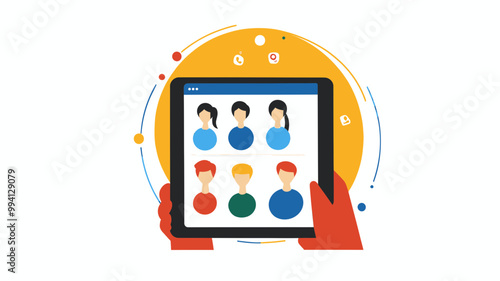 Flat Design Illustration of Social Network Circle Displayed on Tablet for Digital Communication and Virtual Connections, Perfect for Business or Lifestyle Themes