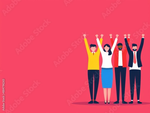 Flat design illustration of team celebrating innovative notion with copy space, emphasizing business victory and deep depth of field.