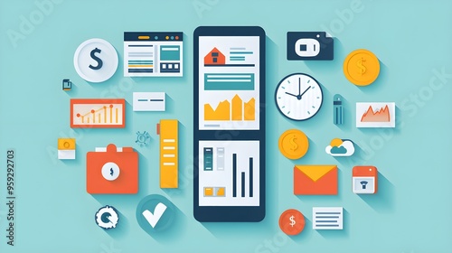 Flat design of a financial app using icons for budgeting, savings, and expenses