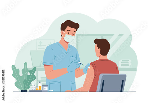 Flat design of a nurse wearing a mask giving a vaccine shot to a patient sitting on a chair