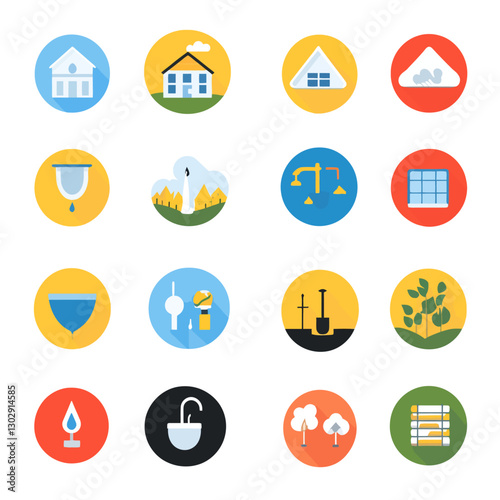 Flat Design Vector Icon Set: House, Scales, Candle, Plants, Shovel, More