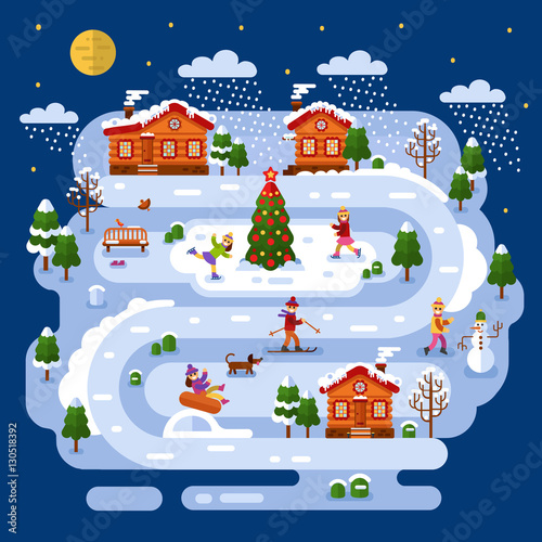 Flat design vector night winter landscape illustration with house, girls and boys skiing and ice skating, pond with xmas tree, snowman, road, bench, trees, snow, snowflakes. Happy Holidays concept.