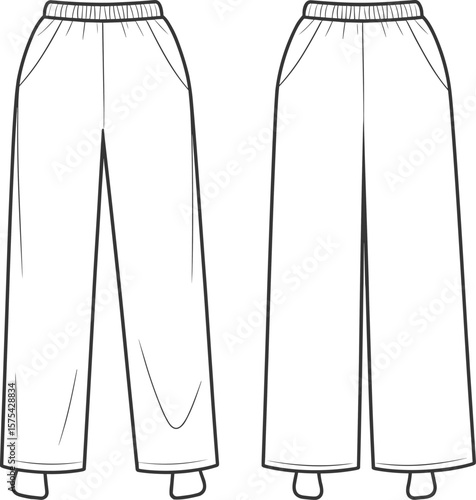 Flat front and back view wide leg pants illustration, fashion design CAD sketch, comfortable fit trousers, technical clothing vector drawing for apparel industry use