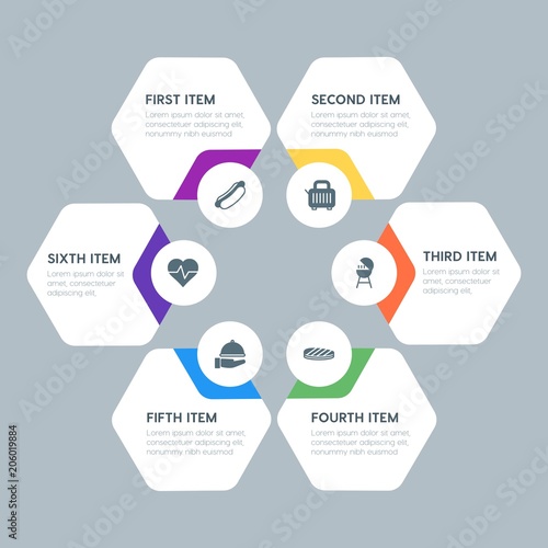 Flat geometric food, health, hotel, drinks infographic steps template with 6 options for presentations, advertising, annual reports.