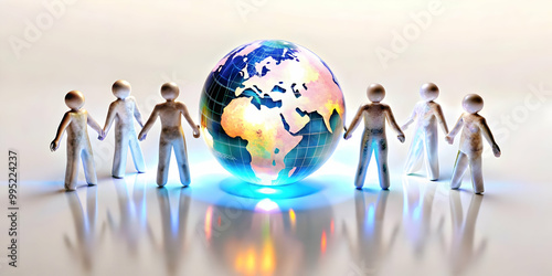 Flat Glossy Holographic Human Figures Holding Hands Around a Glowing Globe, Symbolizing Global Unity and Human Rights - Copy Space Available