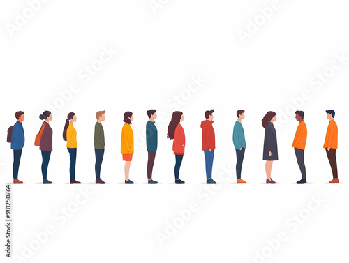 Flat Gravity-Defying Voter Queue Concept: Close-Up of Stylized Human Figures Floating in Line, Symbolizing Voter Turnout & Civic Participation in Simple Vector Illustration