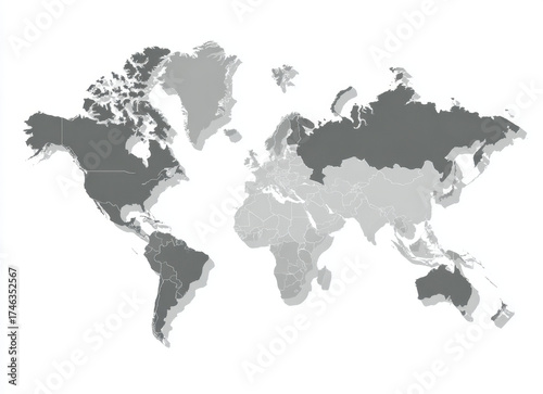 Flat gray vector illustration of world map white background, showcasing various countries and regions different shades of gray. This minimalist design emphasizes geographical outlines and borders