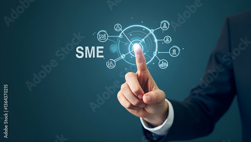 Flat Hand pointing at holographic SME business growth icons with various business related symbols representing growth strategy success of small and medium sized enterprises in empty space concept as H