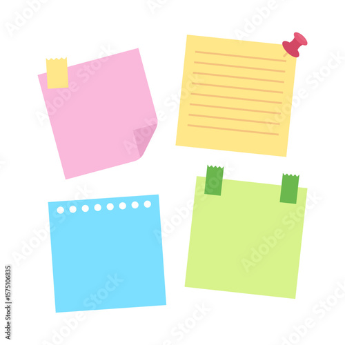Flat icon of four colorful sticky notes with pins and tape. Vector illustration representing reminders, organization, messages, or planning.