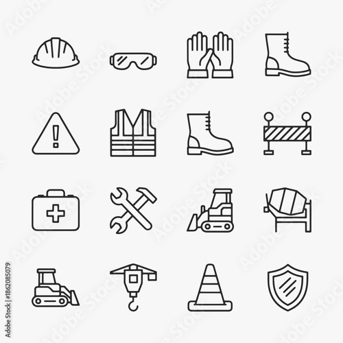 Flat icons for construction, building, and work safety focus on simplicity, elegance, and ease of recognition.