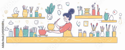 Flat icons set of art supplies and woman painting in studio - linear vector style.