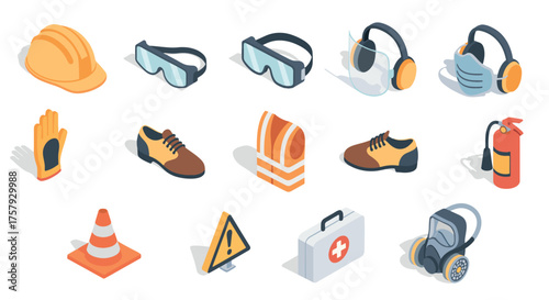 Flat Illustration Isometric icons of safety equipment for construction and industry.