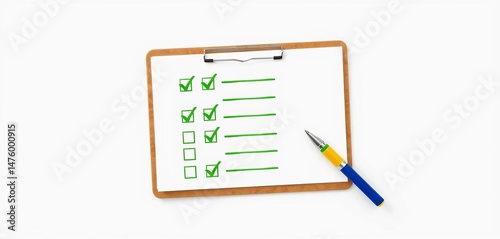 Flat illustration of a clipboard with a green checklist White background, achievement, todo