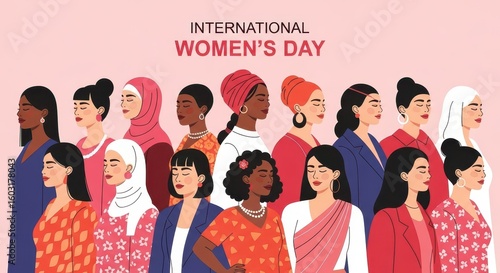 Flat illustration of a diverse group of women from different backgrounds celebrating international womens day