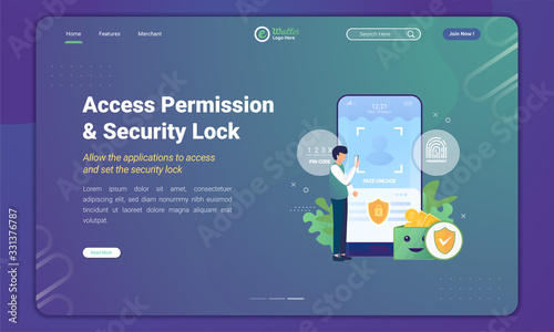 Flat illustration of access permission and security lock screen for digital wallet concept on landing page template