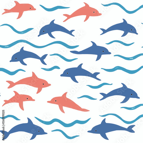 Flat illustration of cartoon dolphins jumping across a white background with soft blue zigzag wave lines, using simplified childlike forms, ideal for packaging and kids ocean-themed projects