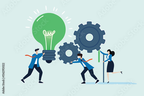 Flat illustration of employees turning giant green ESG lightbulb gear to drive corporate sustainability machine