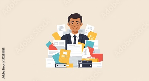 Flat Illustration of Overwhelmed Businessman Surrounded by Paperwork and Files
