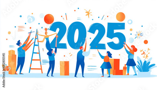 Flat illustration of people working together to paint the numbers "2025" in blue and orange, against a white background