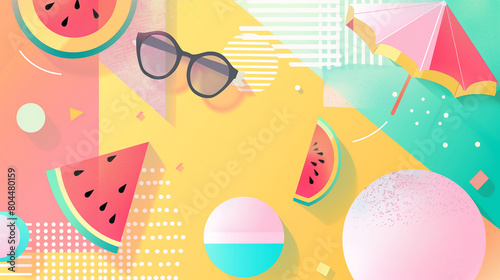 Flat illustration of vibrant summer elements in a simple design centered on a colorful background.