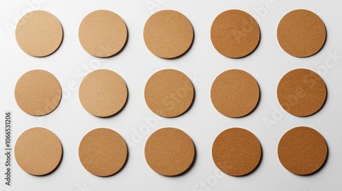 Flat lay arrangement of circular stickers mockup, displaying brown kraft design templates against a clean white background, creating versatile space for text or graphics.