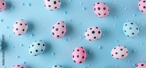 Flat lay banner with pastel Easter eggs and polka dots on solid light blue background, ideal for Easter card designs, spring holiday decorations, and seasonal wallpapers.