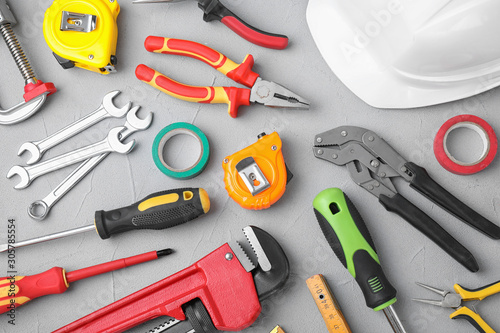Flat lay composition with construction tools on light grey background
