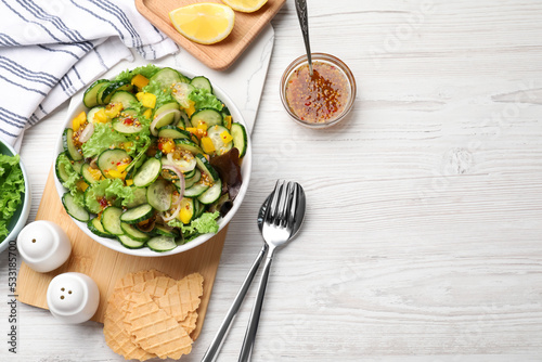 Flat lay composition with delicious cucumber salad on white wooden table. Space for text