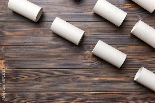 Flat lay composition with empty toilet paper rolls and space for text on color background. Recyclable paper tube with metal plug end made of kraft paper or cardboard