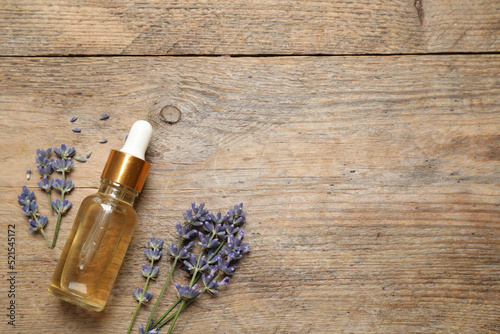 Flat lay composition with lavender flowers and natural essential oil on wooden table. Space for text