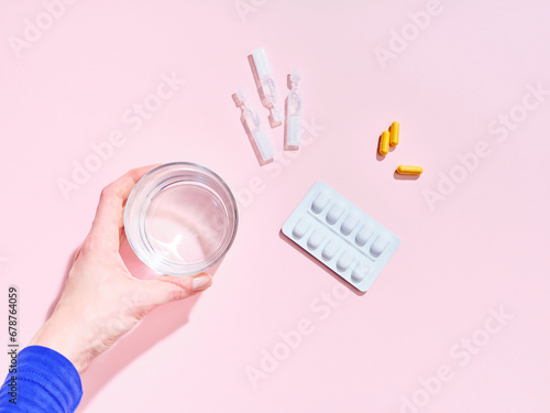 Flat lay creative composition with food supplement pills, glass of water and female hand on colorful background