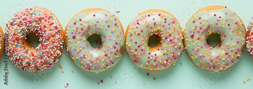 Flat lay glazed doughnuts with colorful sprinkles on a pastel mint green background