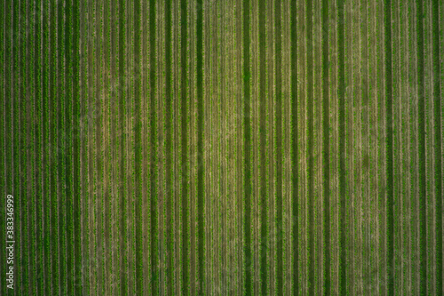 Flat lay, grape plantation in the north of Italy. Vertical strip. High altitude