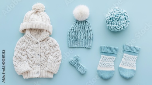 Flat lay of a babyas cozy winter outfit: knitted sweater, hat with pom-pom, and fleece-lined socks, on a pastel backdrop. No people, no logo.