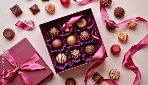 flat lay of a premium chocolate gift box filled with assorted bonbons in velvet lining