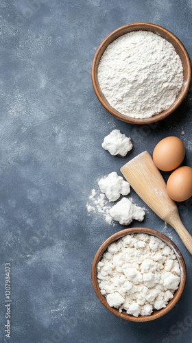 Flat lay of baking essentials including eggs, flour, and kitchen tools on a blue tabletop, fostering a warm cooking atmosphere