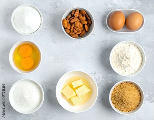 Flat lay of baking ingredients sugar, almonds, eggs, flour, butter, brown sugar. Perfect for baking blogs, recipe websites, or cookbooks.