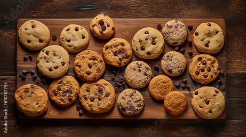 Flat lay of chocolate chip cookies. IA generative.