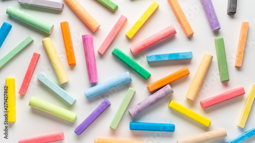 flat lay of different multicolor chalks like background on white, concept of education or business, panorama