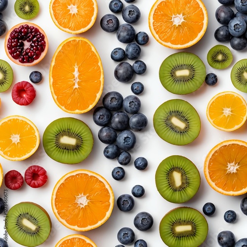 Flat Lay of Fresh Colorful Fruits Oranges, Kiwis, Blueberries, Pomegranate, and Raspberries