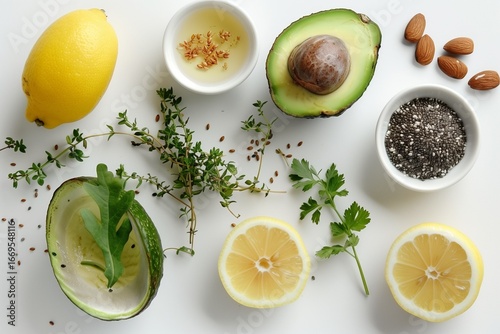 Flat lay of fresh healthy ingredients, avocado, lemon, herbs, nuts, on clean white background.