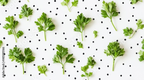 Flat lay of fresh parsley sprigs arranged on a dotted background.