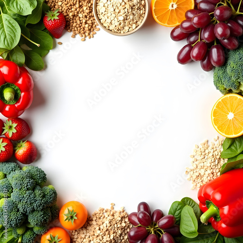 Flat lay of fresh vegetables, fruits, and grains arranged on a clean white surface. Soft lighting enhances their natural vibranc.