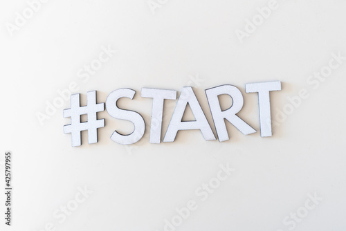 flat lay of hashtag word start, concept of new activity