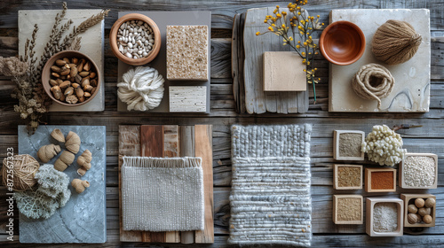 flat lay of interior design material samples, warm, peach fuzz color of the year tones, textures of wood, wool, and stone