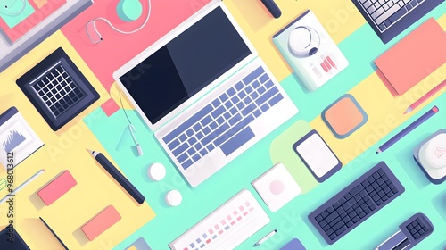 Flat Lay of Laptop Keyboard and Office Supplies on Colored Background
